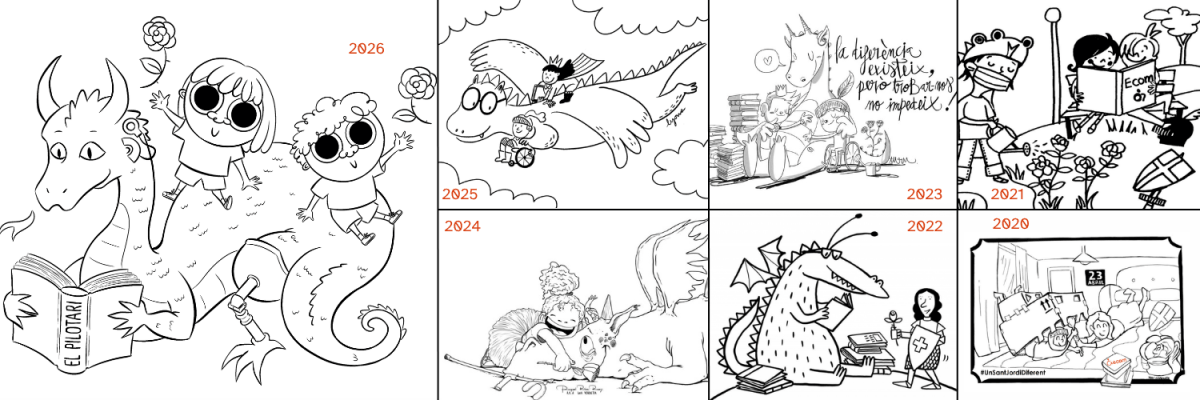 Des de l'any 2020, de la mà d'artistes referents, ECOM presentem una il·lustració de Sant Jordi. Durant les 5 primeres edicions, convidàvem a la ciutadania a pintar-la sense utilitzar la mà dominant: proposàvem, per exemple, usar la boca o els peus. Per al #SantJordiDivers26, però, la proposta canvia: cal seguir les consignes que hi ha al revers de la il·lustració i que permeten posar-se a la pell de persones amb discapacitat diverses.